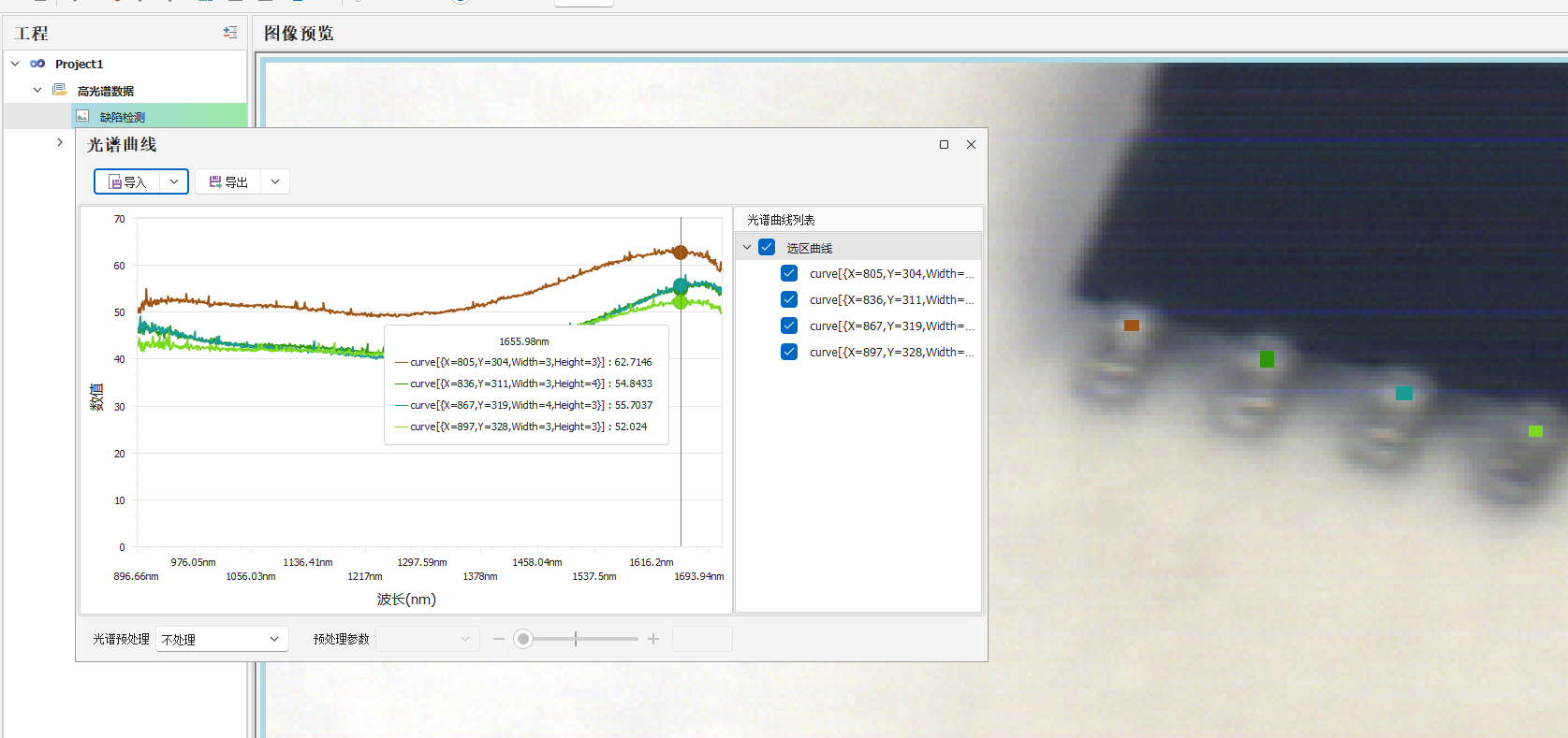 900-1700nm下拍攝結(jié)果,可以看到單獨一塊芯片的四個針腳的光譜,其中第一個的位置反射率明顯高于其他幾個