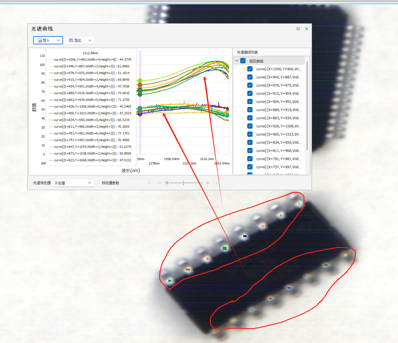 從RGB偽彩圖中也可以看出,右下角芯片針腳存在黃變的顏色變化,在選擇其光譜曲線查看時,也可以看出明顯的不同。