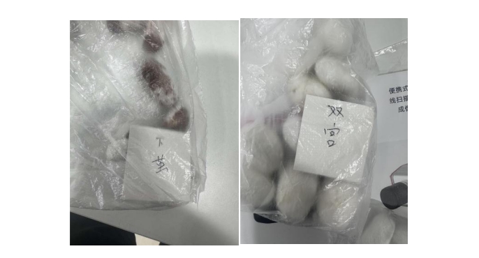 這是客戶給我們寄來的樣品,樣品共分為五類,有上品,下品,內(nèi)印,雙宮,黃斑幾個等級,由于蠶繭內(nèi)部蟲子死亡也會造成整體蠶繭受影響,過往是靠人工根據(jù)外觀進行挑選,但內(nèi)部的損壞通常難以觀察,內(nèi)印就是此類情況,客戶需求要在無損檢測的前提下做到把上品與雙宮等良品蠶繭從中挑選出來,接下來看實際測試。