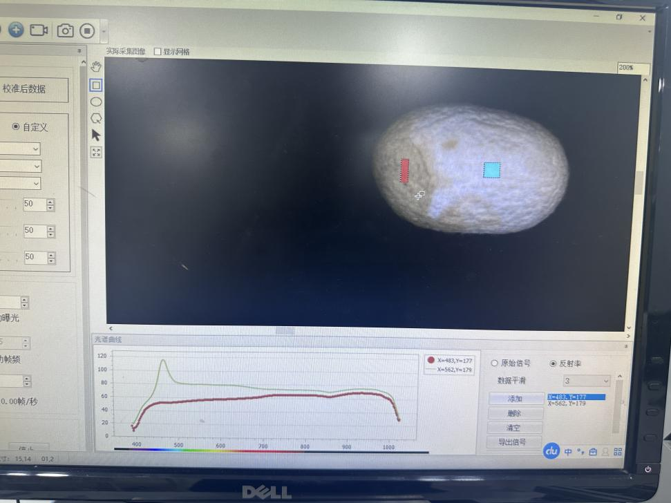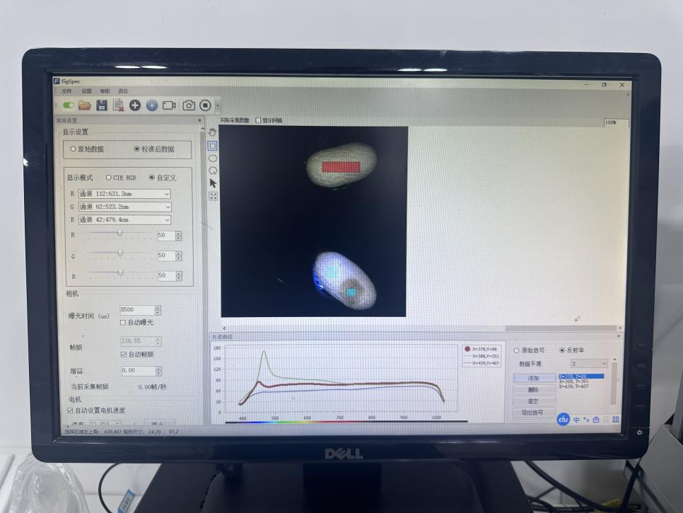 400-1000nm下拍攝結(jié)果,可以看到內(nèi)部蟲體死亡的狀態(tài)下,會緊緊貼著內(nèi)壁,在燈光照射下,很清晰的就能看到,而正常的蠶繭,則蟲體在內(nèi)部可以四處晃動,燈光照射無法顯現(xiàn)。通過選擇不同區(qū)域,正常的和黑色區(qū)域,也可以看到其反射光譜曲線有存在差異,400-500納米區(qū)間,無黑斑的地方反射率明顯高一部分,通過后期數(shù)據(jù)建模,可以有效進行分別,并且通過面積計算,也可以更精確的判斷出所占比面積,能更細化的分別。