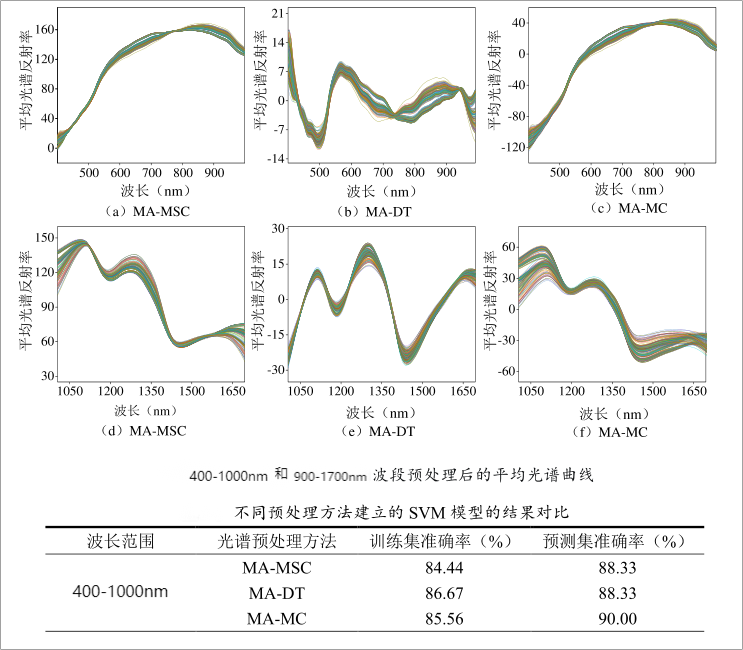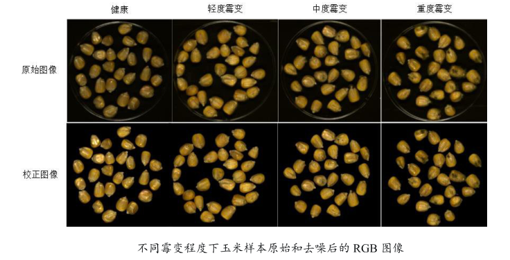 不同霉變程度下玉米原始和去噪后的 RGB圖像如圖所示。獲取高光譜圖像的ROI區(qū)域后,計算每個波長圖像下RO區(qū)域內(nèi)所有像素點的光譜反射率平均值,得到樣本的原始光譜數(shù)據(jù)矩陣。由于光譜數(shù)據(jù)在開始波段和結(jié)束波段存在大量的隨機噪聲和無用信息,會影響建效果,因此去除噪聲波段后,在 400-1000nm和900-1700nm波段保留 399-1001nm和1005-1701 nm 波長范圍的光譜數(shù)據(jù)用于進一步的分析,光譜變量分別為389個和112個。