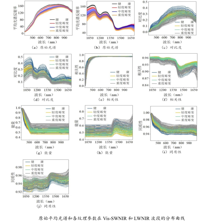 通過分析光譜曲線特征,不難發(fā)現(xiàn),玉米霉變程度越嚴重,兩個波長范圍的光譜反射強度越低,說明霉變組織的光吸收能力比玉米組織強。在400-1000nm 波段,光譜曲線單調(diào),在 399-820nm波長范圍平均光譜強度逐漸增大,然后緩慢下降。而在900-1700nm 波段,光譜曲線復(fù)雜多變,分別在1100nm和1300nm附近捕獲到兩個明顯的反射率峰。前者可能與脂質(zhì)中的C-H有關(guān),后者則是 N-H拉伸的第一泛音與基本 -H 面內(nèi)彎曲和 C-N 拉伸與 N-H 面內(nèi)彎曲振動的結(jié)合。此外,在 1192 nm 和1445 nm 處有兩個明顯的吸收峰。1192nm可能與碳水化合物中C-H拉伸的第二泛音有關(guān),1445 nm 可能與水中的 O-H 鍵和蛋白質(zhì)中 C-H 的第一泛音有關(guān)。不同霉變程度下的反射率光譜和紋理強度存在顯著差異,這些差異為不同霉變程度的玉米判別提供了可能。但是,不同霉變程度的玉米樣品平均光譜值在某些波長范圍(1400-1701nm)存在交叉重疊,反射率光譜與霉變程度無顯著相關(guān)性。因此,需要將光譜數(shù)據(jù)和紋理特征進行融合,進一步研究其潛在信息的分類能力。