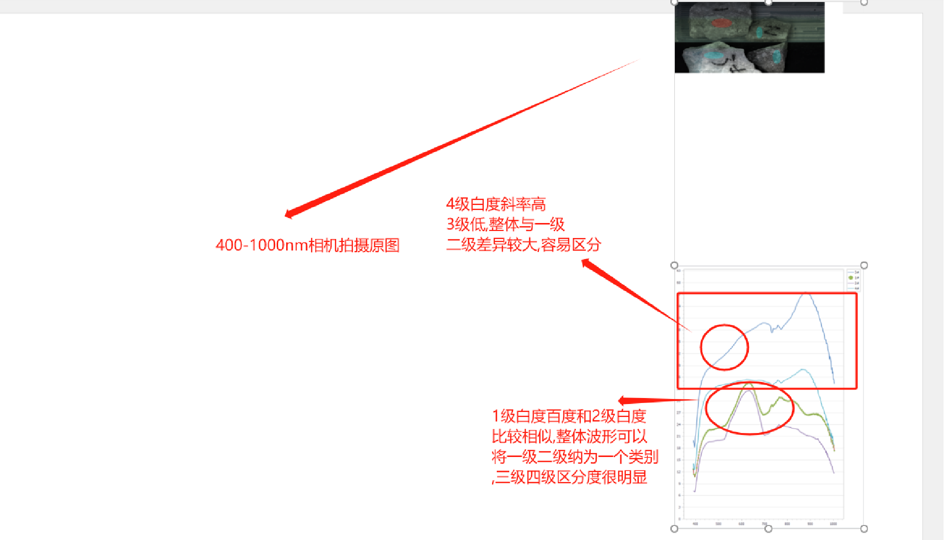可使用400-1000nm高光譜相機(jī)FS-13+臺(tái)架,檢測(cè)碳酸鈣白度分級(jí),在識(shí)別的可行性上來(lái)說(shuō),完全可行,同時(shí)發(fā)現(xiàn)一級(jí)白度和二級(jí)白度的反射率差異十分微小,僅發(fā)現(xiàn)倆處微小差異,如下圖所示: