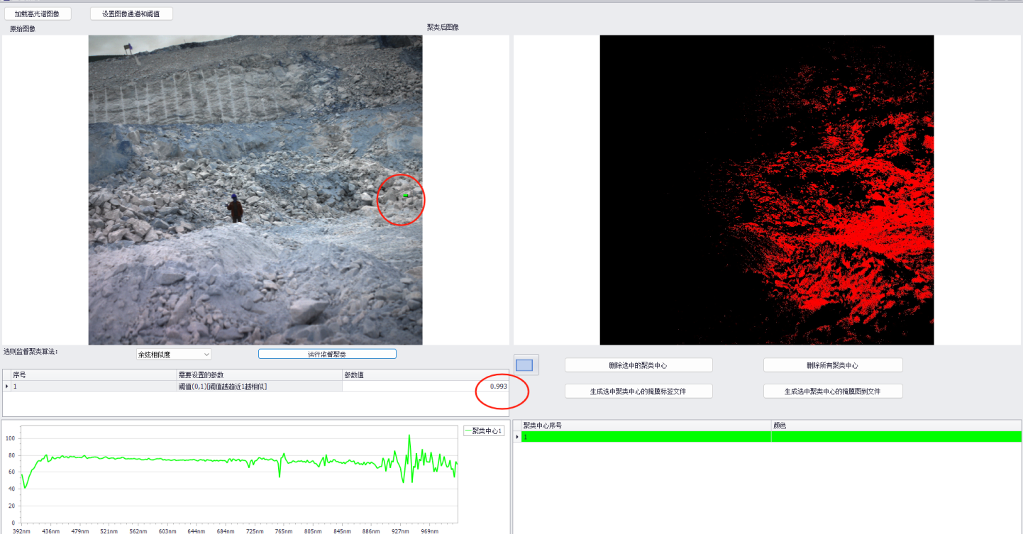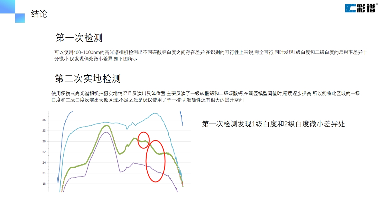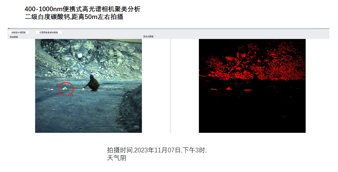 可使用便攜式高光譜相機(jī)FS-23拍攝實(shí)地情況且反演出具體位置,主要反演了一級(jí)碳酸鈣和二級(jí)碳酸鈣,在調(diào)整模型閾值時(shí),精度逐步提高,所以能將此區(qū)域的一級(jí)白度和二級(jí)白度反演出大致區(qū)域,不足之處是僅僅使用了單一模型,準(zhǔn)確性還有很大的提升空間。