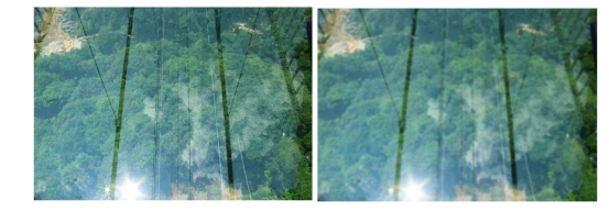 霧度又稱濁度.表示透明或半透明材料不清晰的程度.是材料內(nèi)部或表面由于光散射造成的云霧狀或混濁的外觀.以散射光通量與透過材料的光通量之比的百分率表示。通常僅將偏離入射光方向2.5度以上的散射光通量用于計(jì)算霧度。距離產(chǎn)生美,霧度也一樣,同一塊材質(zhì)的玻璃,霧度不一樣,展示效果也不一樣,如圖所示:
