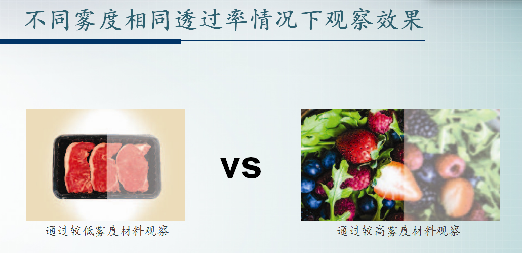 霧度和透過率是透明材料兩項(xiàng)十分重要的光學(xué)性能指標(biāo),在包裝應(yīng)用中朦朧的薄膜可能會(huì)降低消費(fèi)者的質(zhì)量感受,例如包裝產(chǎn)品看起來模糊不清。一般來說,透光率高的材料,霧度值低,反之亦然,但不完全如此。有些材料透光率高,霧度值卻很大,如毛玻璃。所以透光率與霧度值是兩個(gè)獨(dú)立的指標(biāo)。