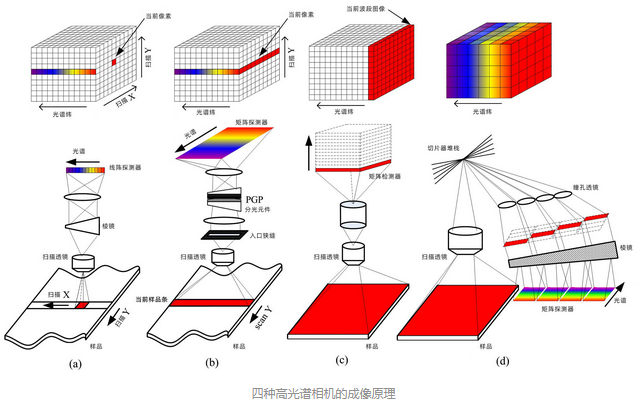 根據(jù)高光譜相機的掃描原理,可以分為4種,也是目前市面上最常見的4種的高光譜相機:點掃描高光譜相機,線掃描高光譜相機,光譜掃描高光譜相機和快照高光譜相機。在圖像采集、顏色檢測應(yīng)用過程中,這4種高光譜相機都可以獲得不同波長的圖像。
